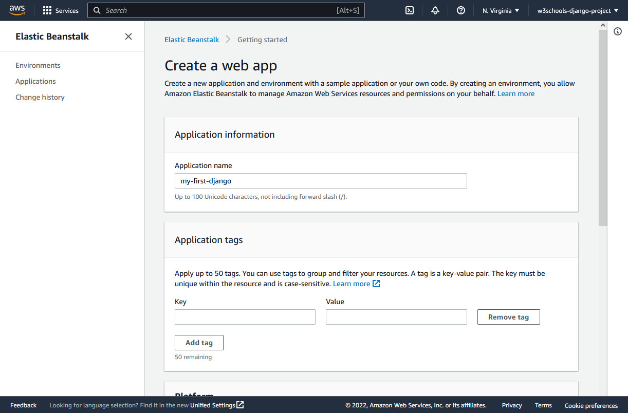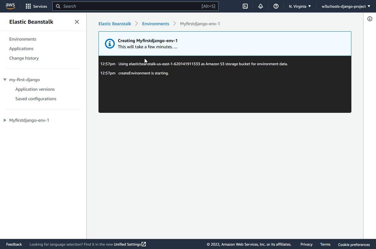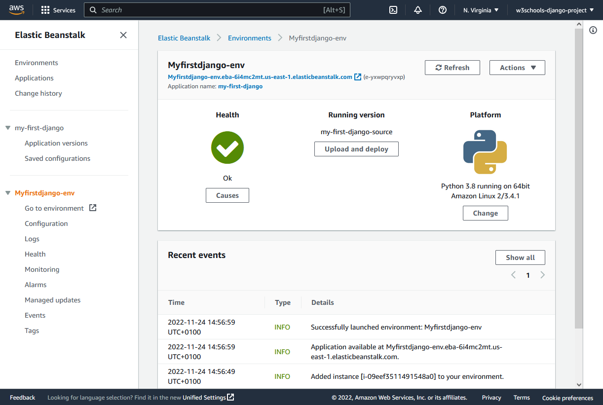 Finally the project is live, and you can view it by clicking the link below the Myfirstdjango-env header, or type the host address in your browser: