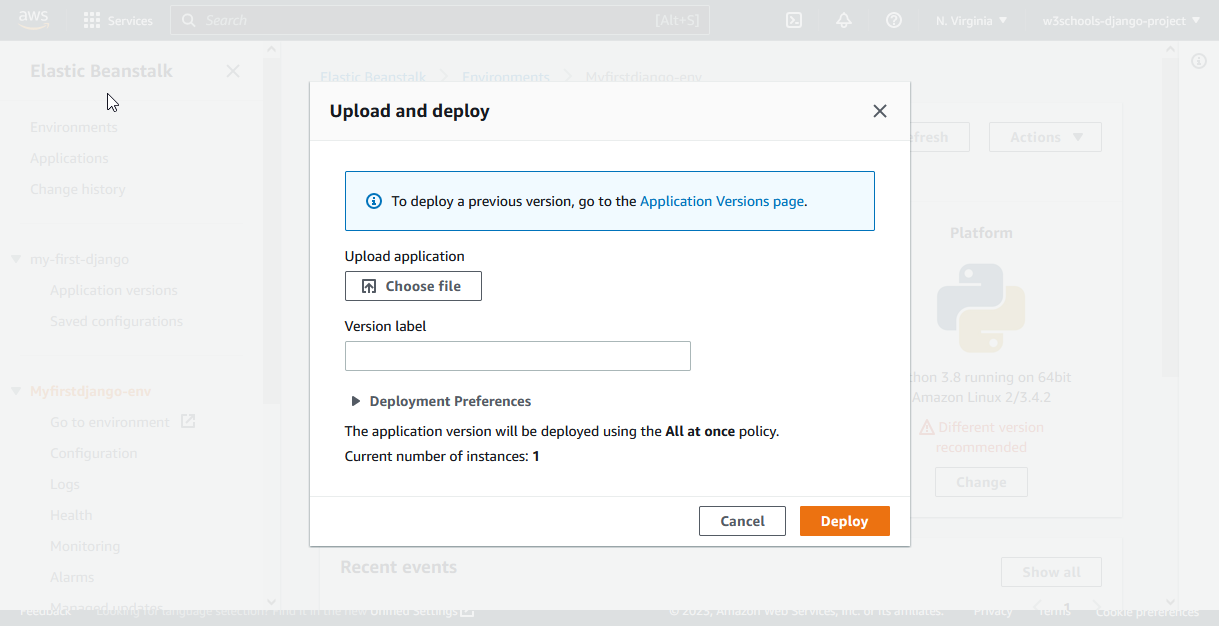 Now you have a .zip file, containing the changes, and you can upload it to Elastic beanstalk: