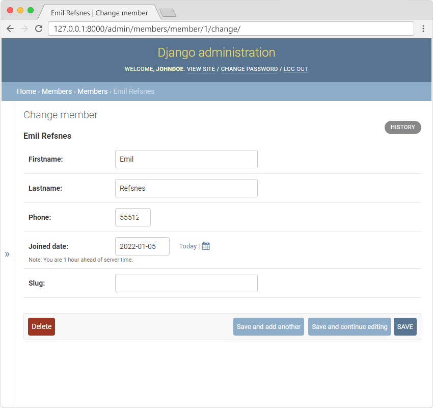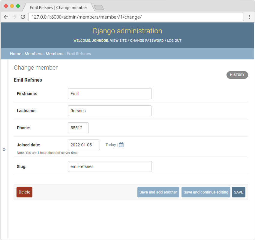 If you have followed all the steps on your own computer, you can see the result in your own browser: 127.0.0.1:8000/members/.