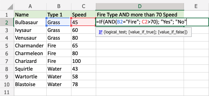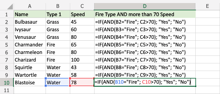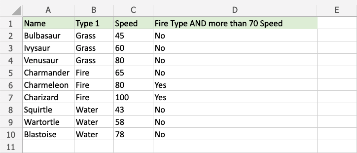 Now each row has a check for both being Fire type and Speed greater than 70: