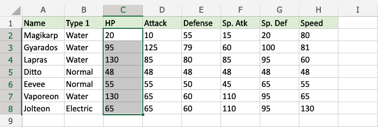 Gyarados, Lapras and Vaporeon have HP values greater than 65, so they are highlighted.