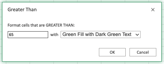 The "Greater Than..." Highlight Cell Rule will highlight a cell with one of the appearance options based on the cell value being greater than to your specified value.
