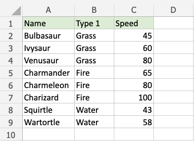 Charizard has the highest Speed value (100) and Squirtle has the lowest Speed value (43).