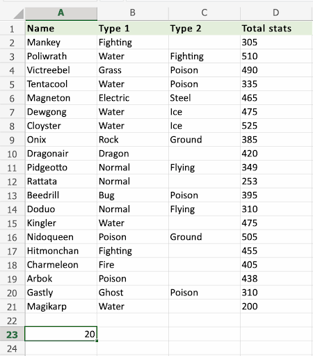 Apply the =COUNTA function to range A2:A21, counting Pokemons by their names, which are letters only: