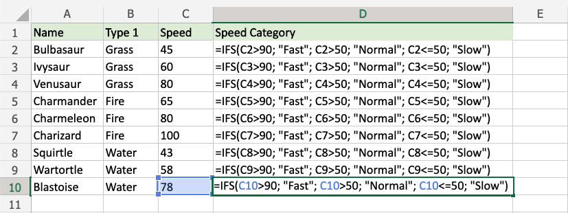 Since the value in cell C2 is "45", the first and second conditions are false, and third condition is true (less than or equal to 50), the function will return "Slow".
