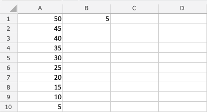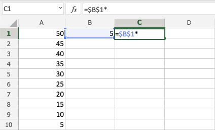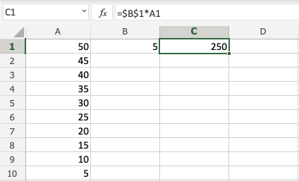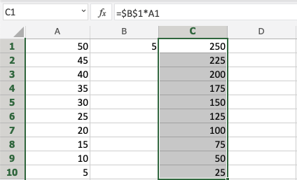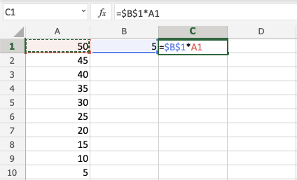 You got it! You have successfully used absolute reference to multiply B1(5) with the range A1:A10.