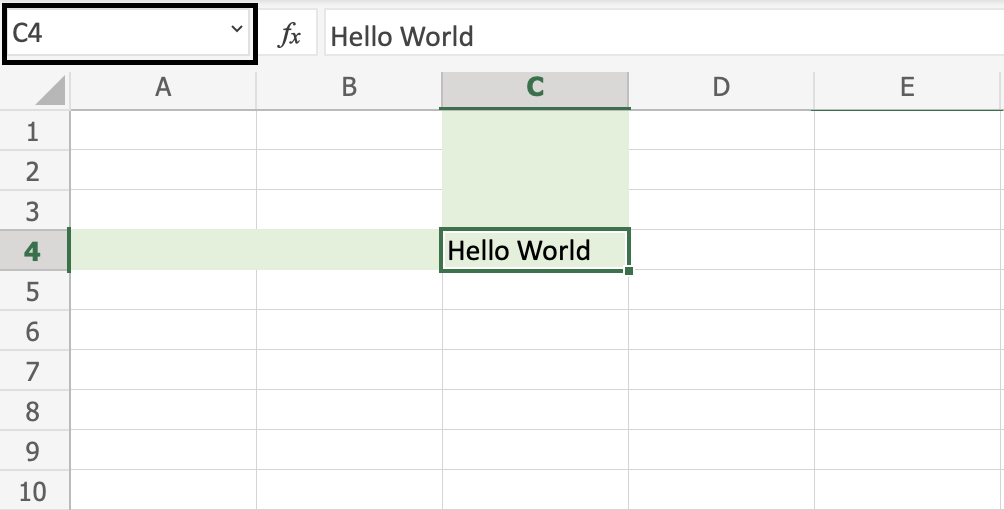 Have a look at the picture below. Hello world was typed in cell C4. The reference can be found by clicking on the relevant cell and seeing the reference in the Name Box to the left, which tells you that the cell's reference is C4.