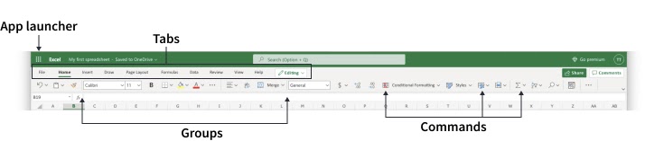 The Ribbon is made up by the App launcher, Tabs, Groups and Commands. In this section we will explain the different parts of the Ribbon.
