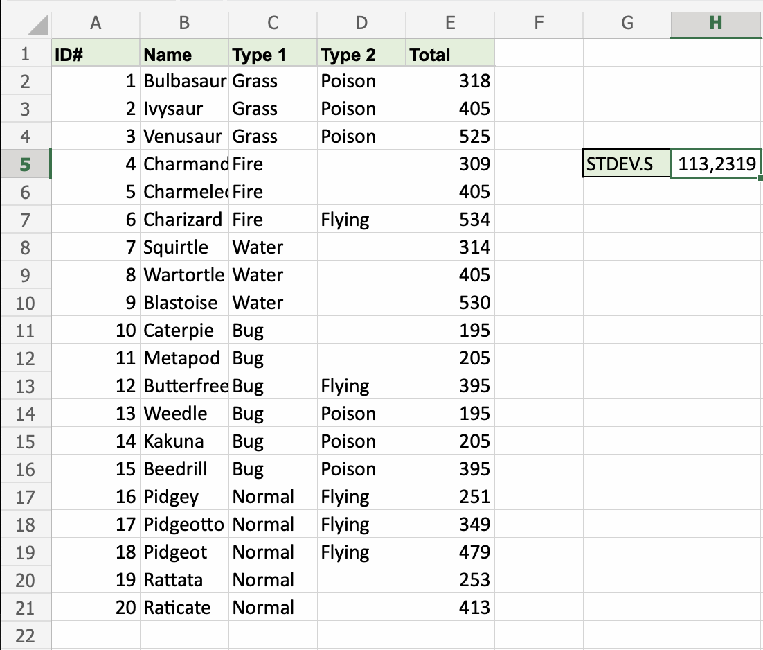 That's the way! The STDEV.S function has successfully returned the Standard Deviation 113,2319 for the sample of Pokemons Total stats.