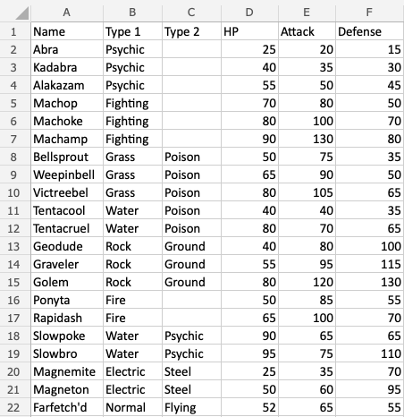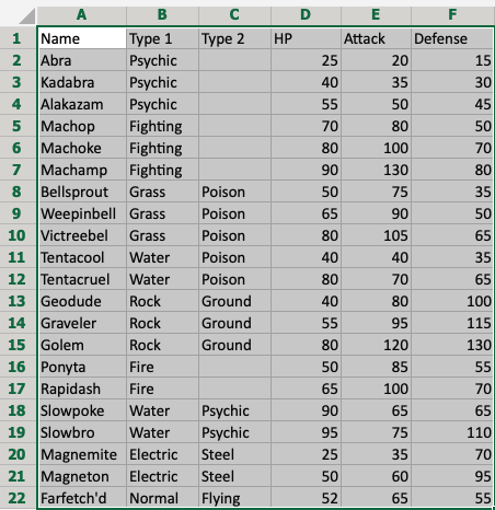 Note: The range (A1:F22) already has headers in row 1. Unchecking the "My table has headers" option allows you to create a dedicated header if you do not already have it.