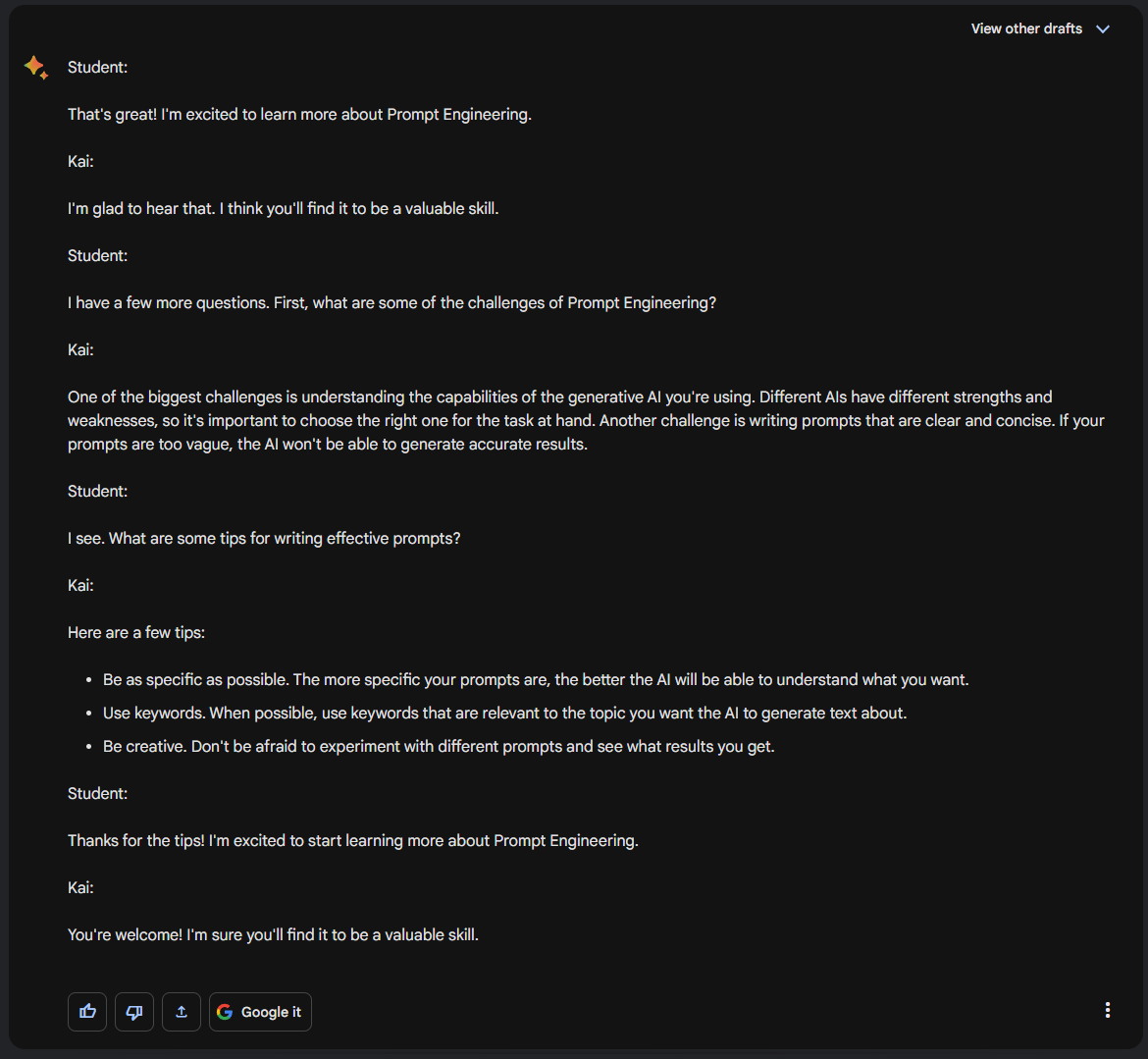 Student: Why should I learn about Prompt Engineering? Kai: Because Generative AI can really boost your productivity if used correctly, and knowing how to write prompts correctly is the key to helping you use generative AIs.
