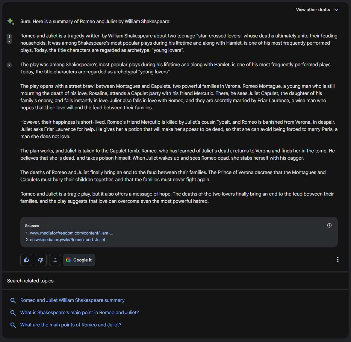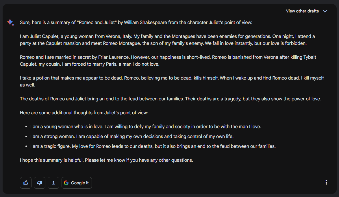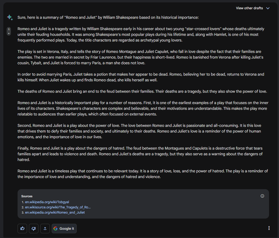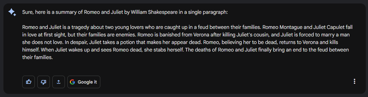 The previous example provided a basic summary of "Romeo and Juliet", but let's try and ask a few different ways: