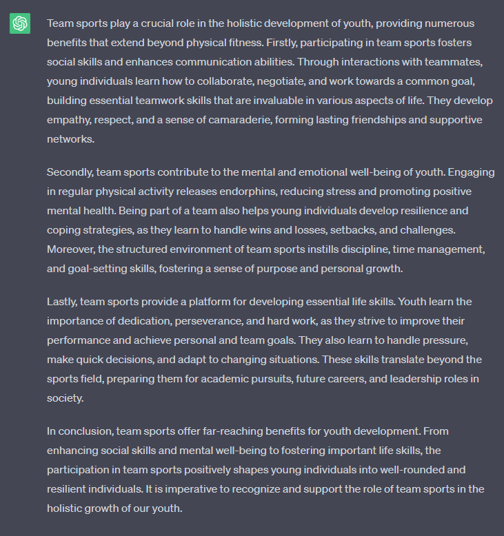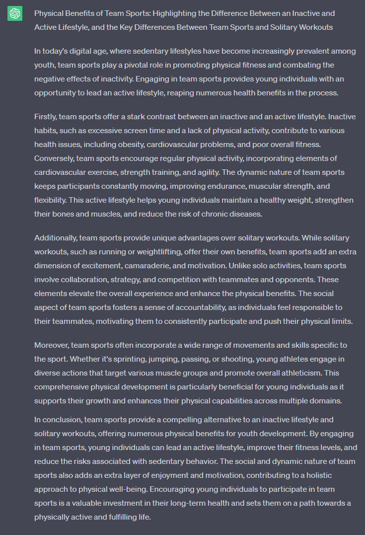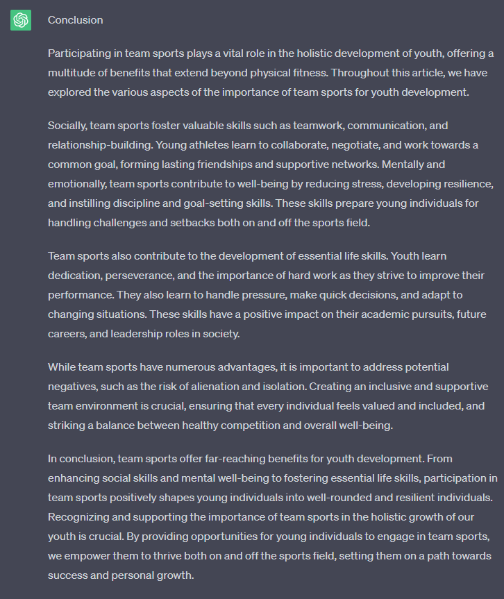 In our example, we will use the text 'For an article about "The importance of team sports for youth development", write a section about xyz' as a starting point: