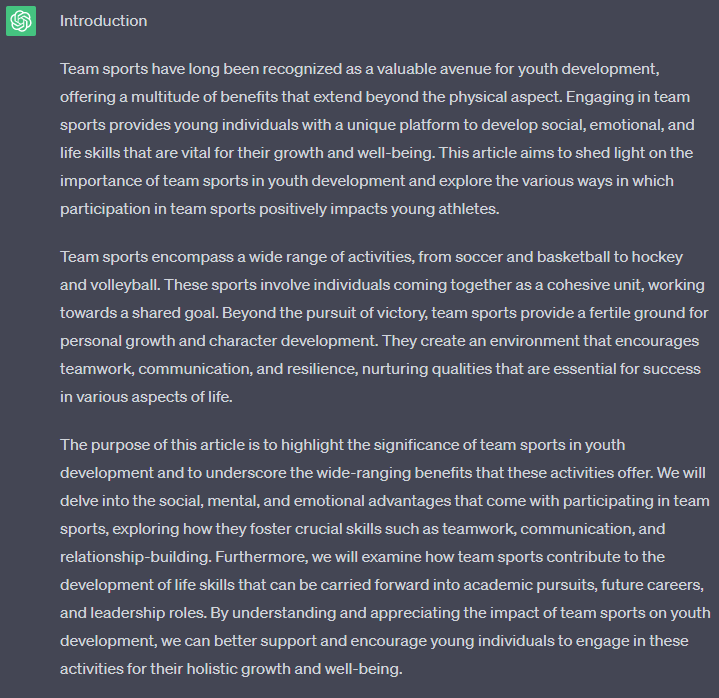 For an article about "The importance of team sports for youth development", write a section about "Introduction - including information about team sports and the purpose of the article":