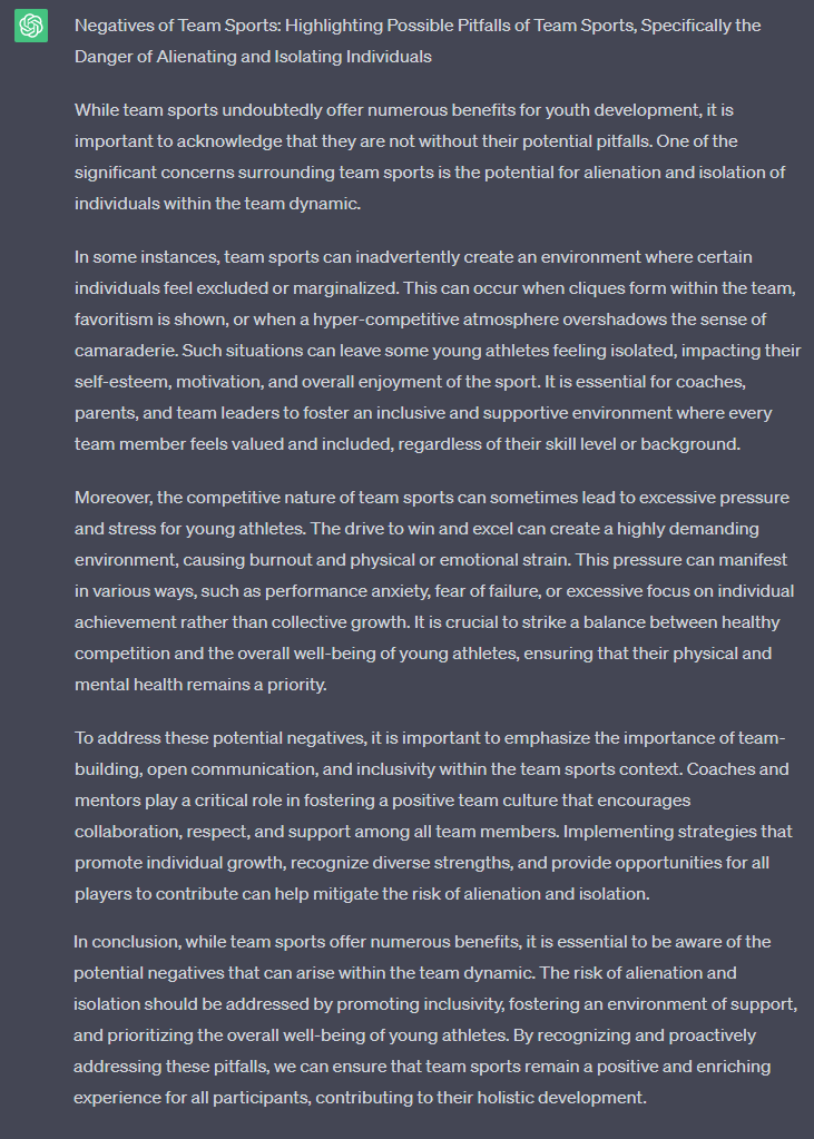 For an article about "The importance of team sports for youth development", write a section about "Negatives of Team Sports - Highlighting possible pitfalls of Team Sports, specifically the danger of alienating and isolating individuals":