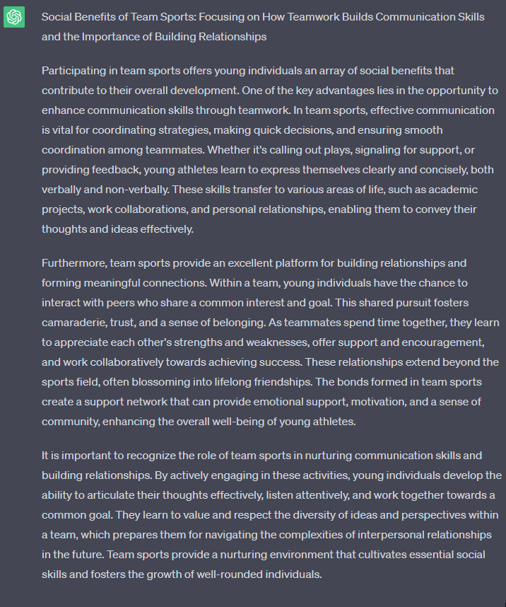 For an article about "The importance of team sports for youth development", write a section about "Social Benefits of Team Sports - Focusing on how teamwork can help build communication skills, and the importance of building relationships":