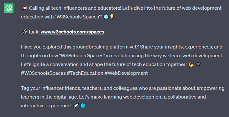 Create a LinkedIn post that asks tech influencers and teachers to discuss "W3Schools Spaces". Include a link to the product.