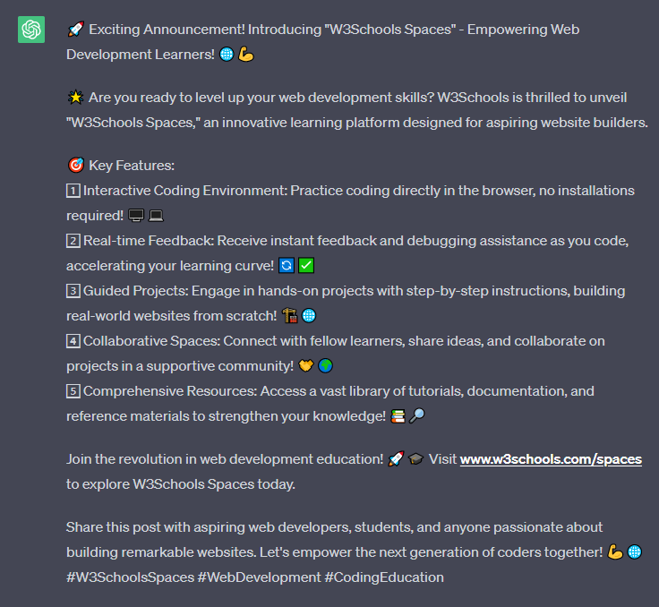 Create a LinkedIn post that announces "W3Schools Spaces" and its key features for people learning to build websites