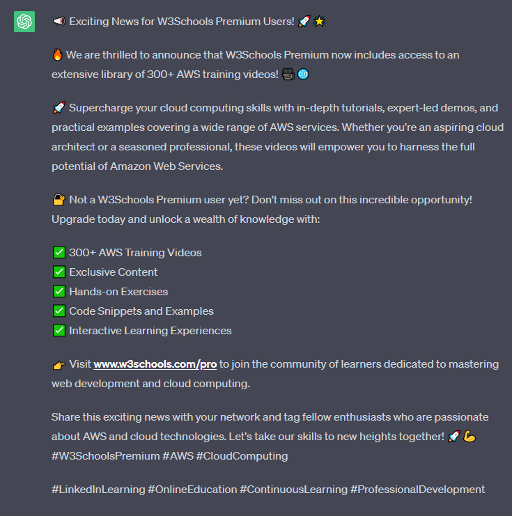 Create a LinkedIn post about how "300+ AWS training videos" are now included for W3Schools Premium users. Include a call to action.
