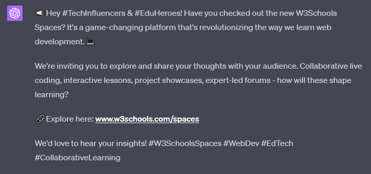 Create a Twitter post that announces "W3Schools Spaces" and its key features for people learning to build websites