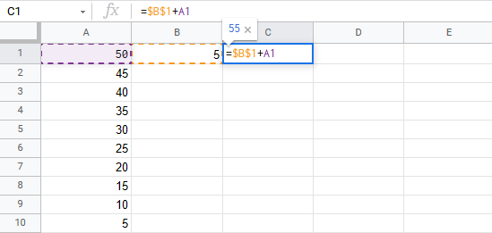 Great! You have successfully used absolute reference to add B1(5) with the range A1:A10.
