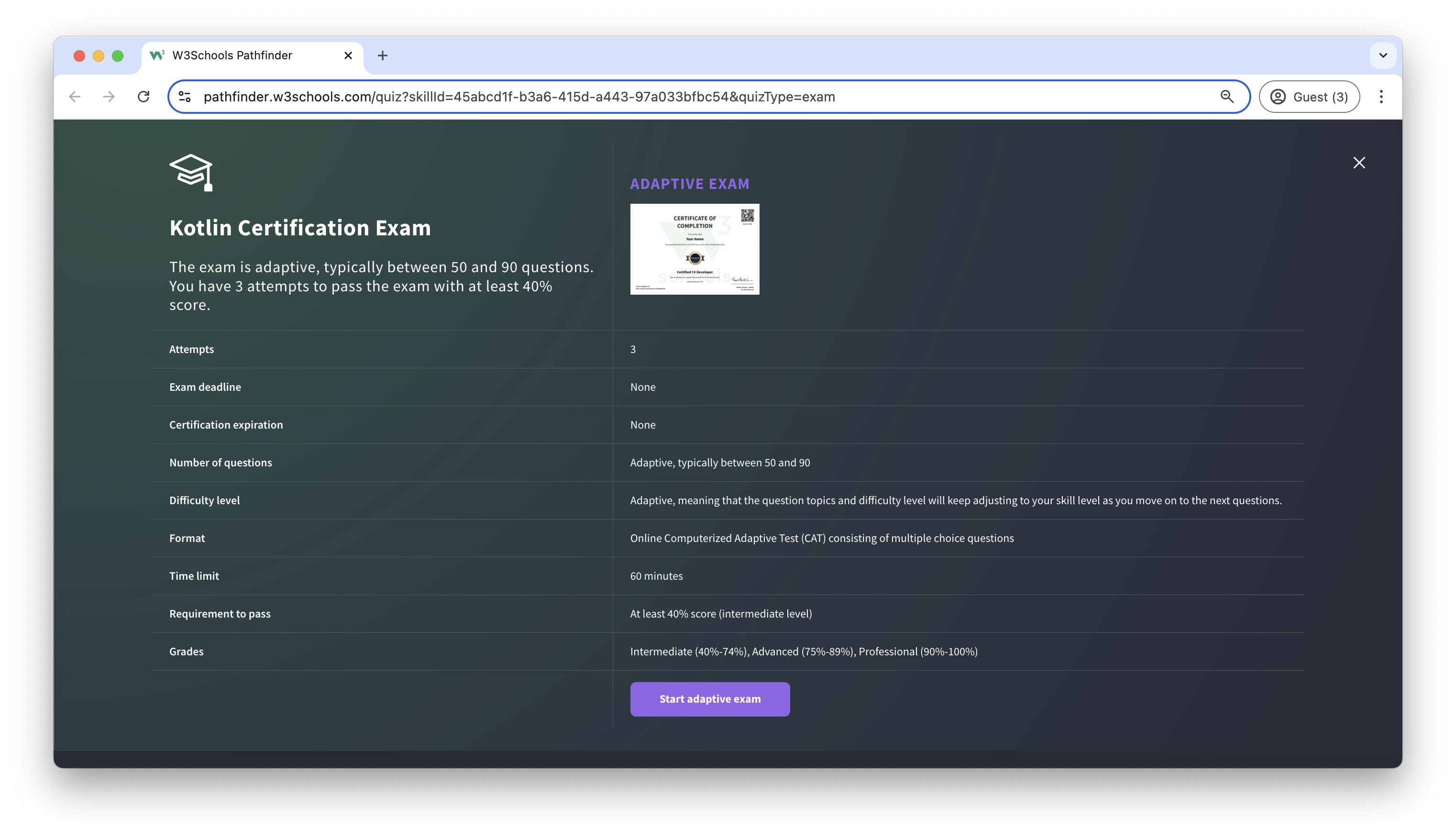 The Kotlin exam is a test that summarizes the W3Schools Kotlin syllabus.
