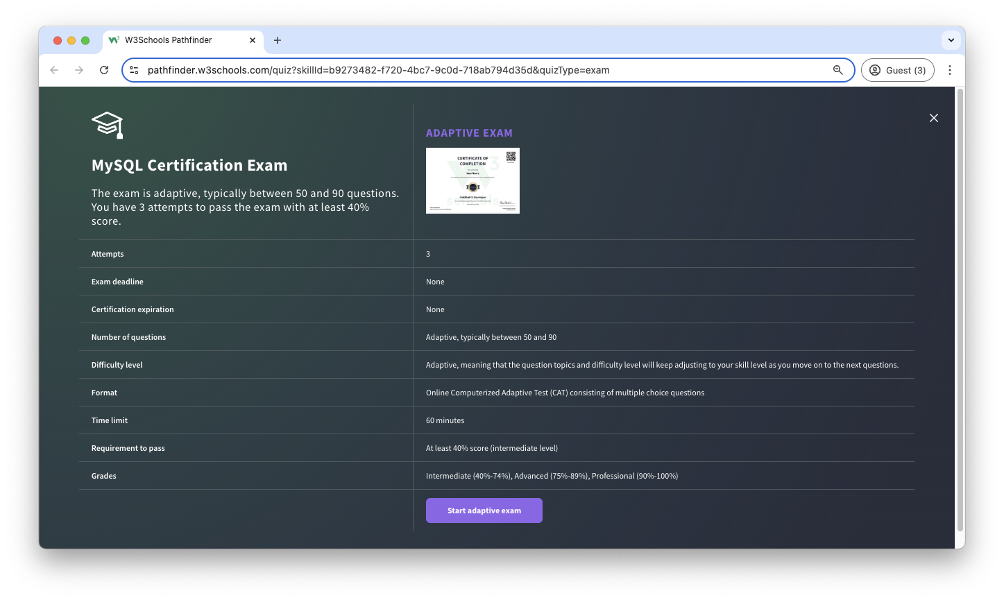 The certification exam is adaptive and graded; students will get a grade from intermediate, advanced to professional.