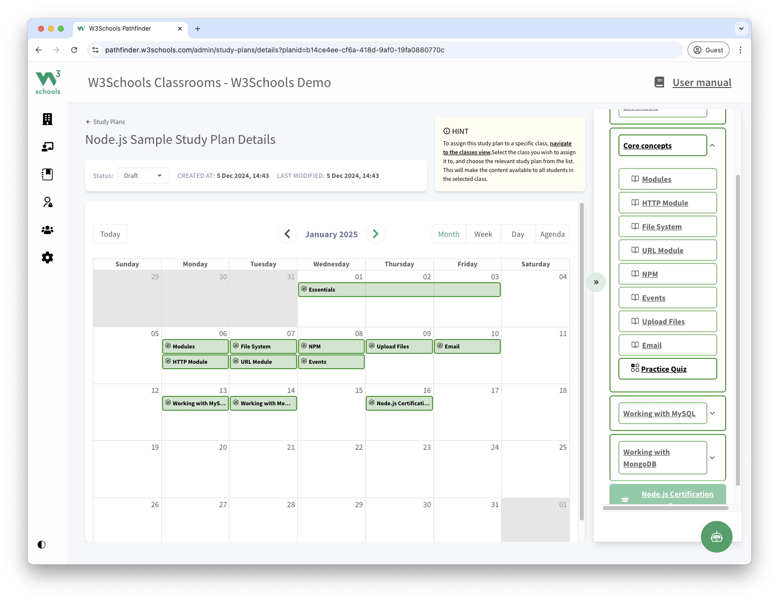 Save time with pre-built teacher materials and study plans. Easily organize your class with a timeline from the introduction of Node.js to the final exam.