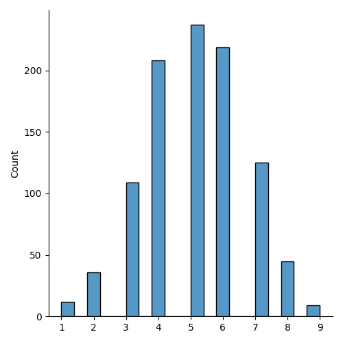 sns.displot(random.binomial(n=10, p=0.5, size=1000))